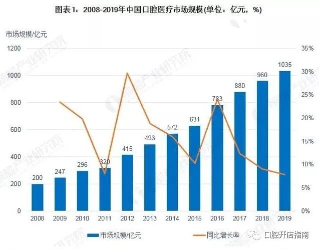 根据历年中国卫生与健康统计年鉴,2010~2018年,中国口腔医院门诊就诊数量从1800万人次增至4012万人次;中国口腔医疗行业的市场规模也随之不断增长,从2008年底的200亿元增至2017年的880亿元,十年复合增速18%,2019年达到1035亿元。