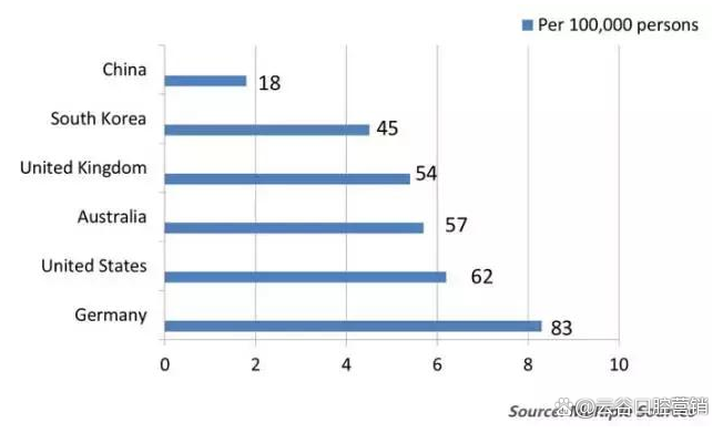 中国人口基数大,每十万人口只有18个牙医来覆盖,而韩国有45名牙医,英国有54名牙医,澳大利亚有57名牙医,美国有63名牙医,德国有83名牙医。