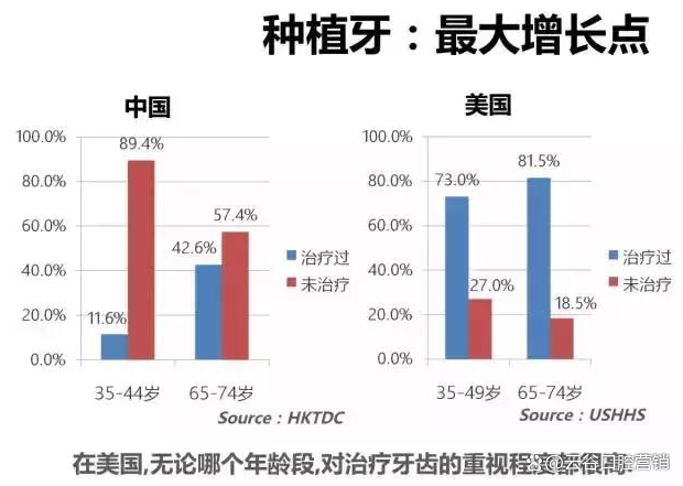 所以,补牙在内地还未形成很高的重视程度。大多数人都是要到了自己年老的时候大家才开始真正的重视这个问题。那么,治疗牙齿缺失的这种高端种植牙的渗透率可能就更低了。这一点与发达国家相比,几乎可以忽略不计。