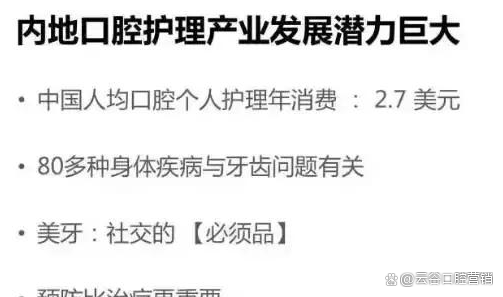 ❸ 随着内地民众对口腔护理的逐渐重视,我们认为口腔预防将变得比口腔治疗更加重要。所以口腔护理市场在这个10年将出现大幅增长。接下来,我将从这几个方面来为大家进行详细剖析。