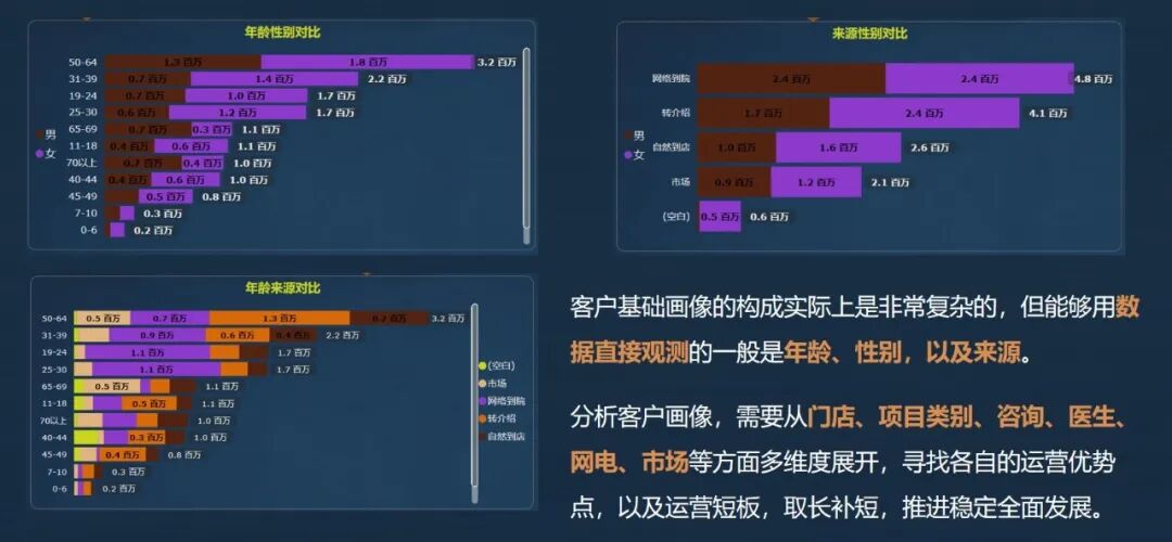 分析客户画像,需要从门店、项目类别、咨询、医生、网电、市场等方面多维度展开。