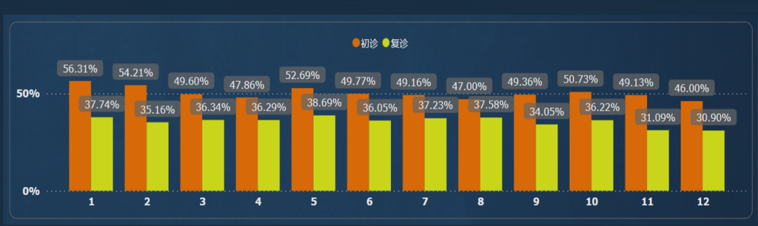 正常而言,初诊人数占比建议控制在30%-40%之间,人数增长的同时,也需要动态关注就诊率占比的变化。