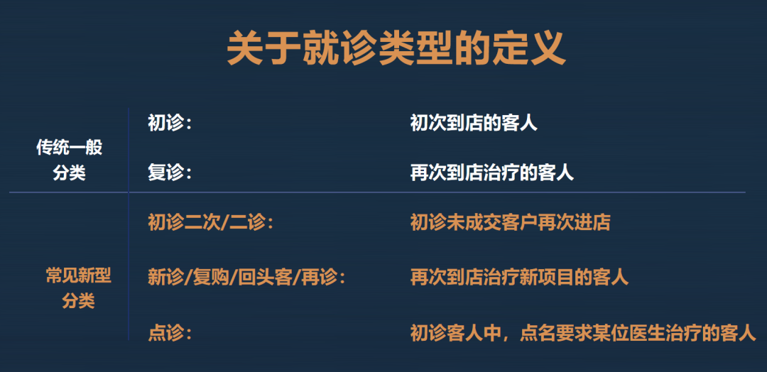 对绝大多数中小门诊而言,就诊类型一般分为初诊和复诊两种,主要区分客户是否首次到店。